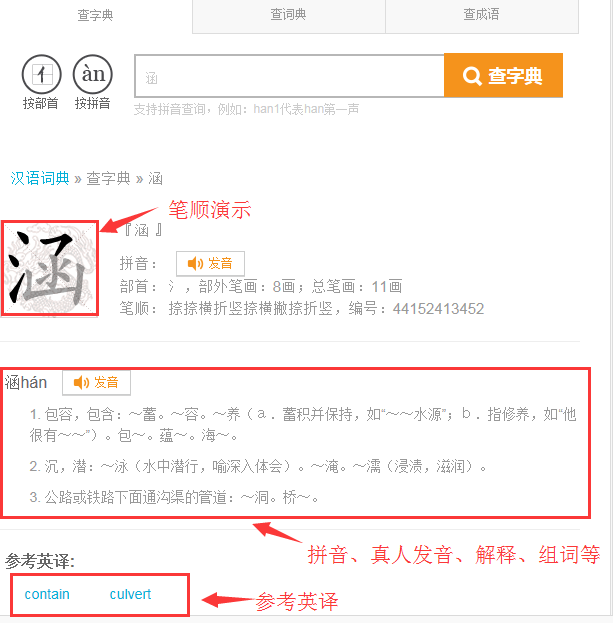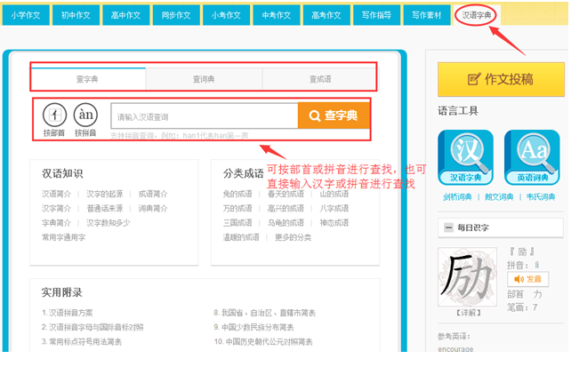 在“汉语字典”中,可查找字、词和成语,可按部首或拼音进行查找,也可输入汉字或拼音进行搜索查找,如下图: