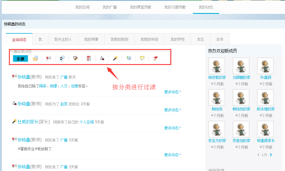"我的动态"可以方便地知道你关心的人(你的班级、你的年级、你的同龄人、你的地区...)在干什么,方便交流、讨论、学习。