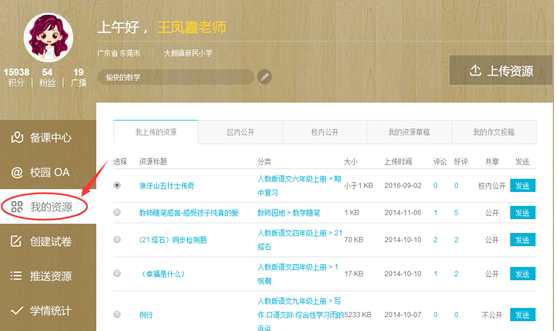 不管共享范围是公开、区内公开、校内公开或不公开,教师都可点击“发送”按钮将自己上传的资源发送给本班学生进行学习。