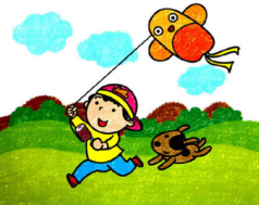 小狗一边跑,一边给小明加油鼓劲。春风轻轻地在小明耳边说着悄悄话,然后春风越吹越大,于是小明的风筝也越飞越高。