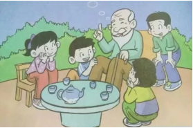 一个夏天的晚上,小朋友们和王大爷在院子里乘凉。他们有的用手托着下巴,有的半蹲着,还有的搂住了爷爷的腿,大家睁大了眼睛,认真地听着爷爷讲故事。