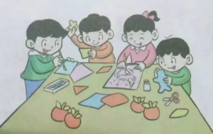 春节就要到了,小朋友们正在做手工。有的在画画,有的在剪纸,还有的正把剪好的卡纸粘在一起。你看,他们做的苹果多好看啊!