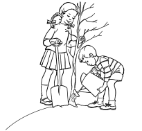 春天到了,弟弟和姐姐来到山坡上植树。他们先挖好一个坑,再把树苗放进坑里。姐姐双手扶着树苗,弟弟给树苗填上土。一棵小树栽好了,他们又给树苗浇上水,看着栽好的树苗,他们心里真高兴。