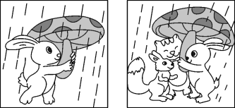 一天,小白兔去森林里采蘑菇,它采到了一个很大很大的蘑菇,心里真高兴。这时,突然下起了大雨,小白兔连忙把蘑菇举过头顶来遮雨。它正往家里跑着,看见松鼠和花猫淋着雨,连忙说:“下雨了,快来我的蘑菇伞下躲雨吧。”它们一起打着蘑菇伞,高高兴兴地回家了 。