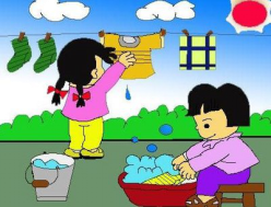 星期天,阳光灿烂,天气真好啊!小红和妈妈在院子里洗衣服。妈妈把衣服洗得干干净净,小红在旁边帮忙把衣服晾到绳子上。一阵风吹过,阳光下的衣服散发出阵阵清香。