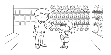 美美和爸爸去商店买东西。商店里的东西可真多啊!各种各样的货物,让他们看到眼都花了。这时,一个放着许多玩具娃娃的橱窗吸引了美美的注意,她高兴地拉着爸爸跑过去。美美拿起一只可爱的小兔玩偶,说:“爸爸,我可以买这个吗?”爸爸说:“不可以哦,家里已经有很多玩偶了。”美美难过极了。