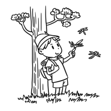 星期天,哥哥去野外探索大自然。树林里有许多高大的树木和说不出名字的野花野草,还传来一些虫子的叫声。空中飞来几只可爱的小蜻蜓,哥哥忍不住伸出手指想碰一下它们。一只蜻蜓停在了他的手指上,探头探脑的,好像在说:“小朋友,大自然欢迎你。”