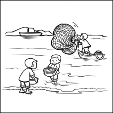 几个渔夫正在海上捕鱼。他们分工合作,有的负责撒网,有的负责把捕到的鱼装到桶里,有的负责把鱼运回岸上。一天下来,他们用辛勤的工作收获了很多鱼。