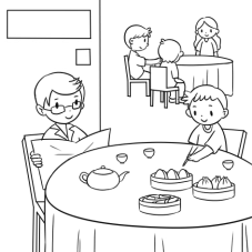星期天早上,妈妈不在家,我和爸爸一起去茶楼喝早茶。茶楼的人可真多啊!我们拿了号,等了很久才有位。爸爸点了我最爱吃的叉烧包、虾饺还有椰汁糕,他坐在旁边一边看报纸,一边喝茶。看我吃得津津有味的样子,爸爸说:“你真是一只小馋猫。”